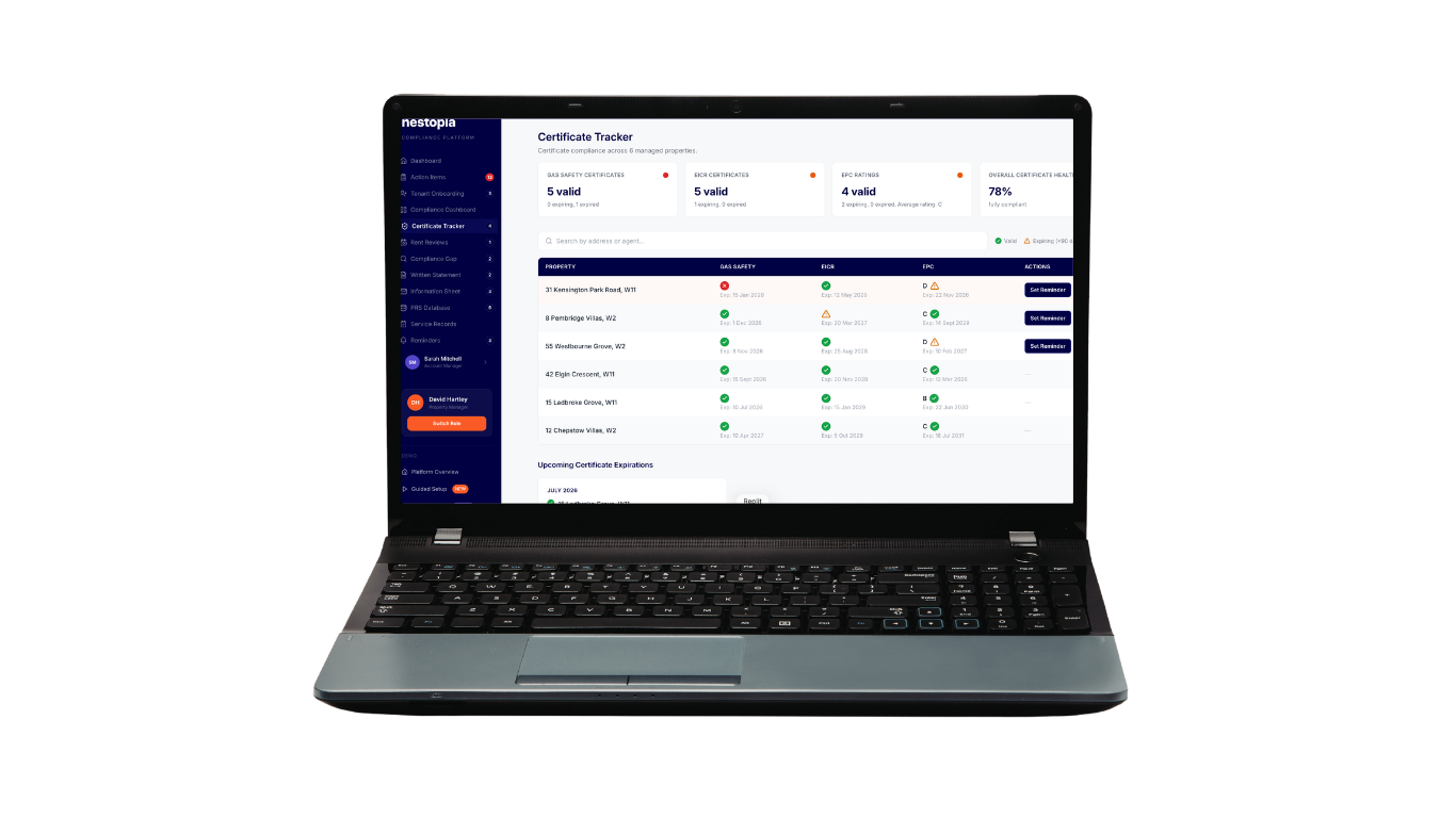 Nestopia automates Written Statement generation, tenant identity verification, certificate tracking, and audit trails. Agents invite tenants to create verified profiles via the Nestopia app. Compliance data flows automatically into the agent dashboard, no manual entry, no gaps, no penalty exposure.